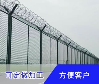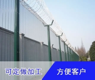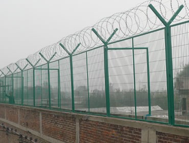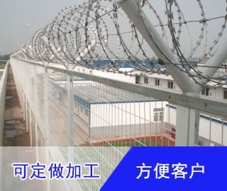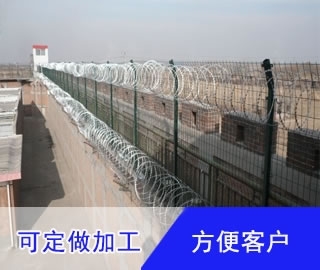 监狱围栏网又称为监狱钢网墙、监狱铁丝网、监狱隔离栅,主要是采用高强度的刀片刺绳与普通防护网的结合,由V型支架立拄,加强型焊接片网,安全防盗连接件和刀片刺绳组成.刀片刺绳是一种新型防护网,由锐利尖角镀锌钢板或不锈钢薄板做刀片,钢丝做芯线组合而成的防护器材。